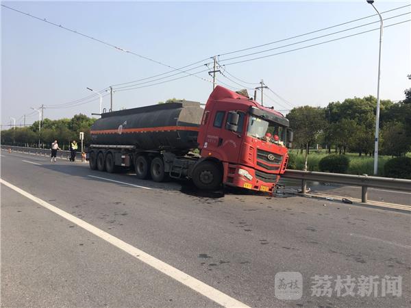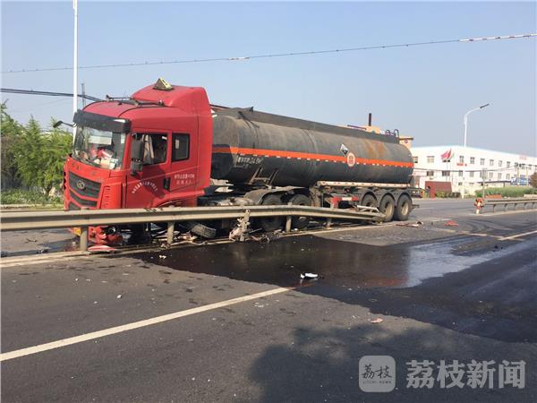 今天(4月23日)下午3点左右,一辆危化品车失控,撞到马路隔离带上,幸运的是,车载罐体完好无损。