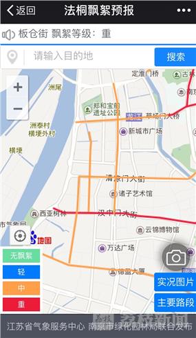 治理一时没有成效,南京市园林管理局开始思考如何短时间内能够为市民提供防护。今年,他们省气象台共同研发了梧桐果毛飘絮预报系统,对法桐航道树两较多的54条道路的飘絮情况进行预报。市民只要通过南京市绿化园林局和省气象台的官网、微信微博等入口,可以找到该系统,最上方的滚动条会在每天早上7点,中午12点和下午5点三个时段滚动更新播报果毛飘絮的程度,大体分为无毛絮、轻度毛絮、中度和重度四个等级。江苏省气象服务中心鲍婧:“我们现在建立了一个经验模型,包括气象要素,和法桐的生长因素,气象要素这块包括风速、温度、相对湿度还有雨量,我们这个系统中也有公众参与的模块,大家可以拍一些图片传到系统上,后台会对这个进行分析,对我们预报治尽心修正。”