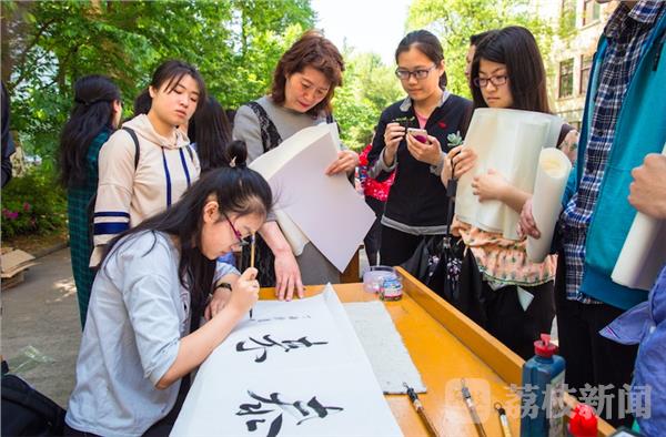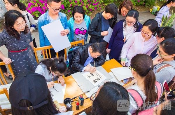 4月26日,图书馆联合校书法协会在梁希广场举办现场笔绘活动,为到场师生题写励志劝学警句,“希望给同学们的学习生活提提气,为大家摆脱拖延症支支招”。 活动发起者之一、书法家协会会员、南方学院曹世鋆同学说。