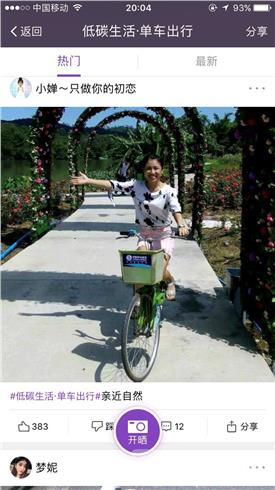 “最近天气这么好,周末我们都会约上小伙伴骑着单车出门游玩,不负大好春光不说还能锻炼身体,关键是大家一起很开心,马上就到的五一假期我们早计划好了,奥森公园约起来!”易信网友“小婵”留言表示,在“晒一晒”上她还留下了自己单车出游的精彩瞬间。 目前,黄橙蓝等各色共享单车的便捷的存车用车及便宜的价格已经吸引了众多网友使用,单车骑行,在欣赏风景的同时,还可以锻炼身体,尤其是在年轻人中间很快就成为了一种非常时尚的游玩方式。