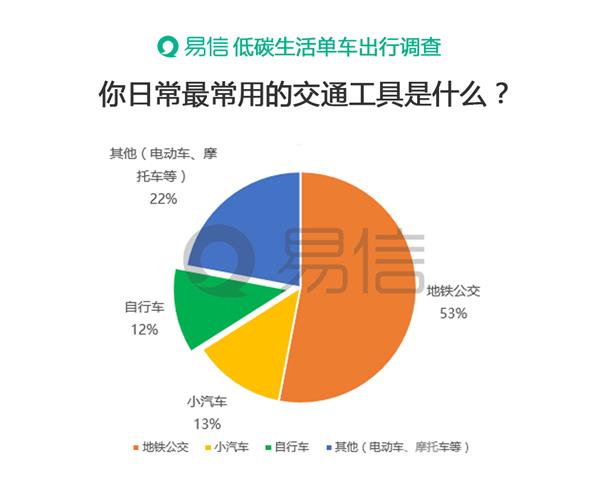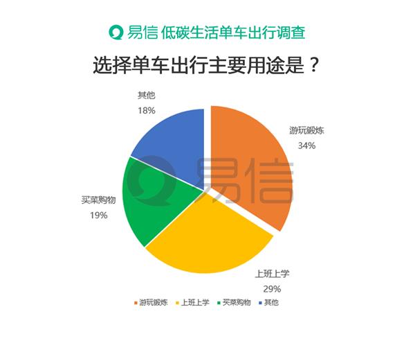 针对目前火热的单车出行,易信在网络展开了一项“低碳生活单车出行”的数据调查,结果显示,单车出行已成为小汽车、公交地铁之外的第三大出行方式,超三成网友表示会选择单车出行游玩锻炼。 单车出行成低碳生活新风尚据易信调查数据显示,在日常出行交通方式选择中,53%的易信网友倾向于乘坐地铁公交出行,13%的易信网友选择了小汽车出行,选择自行车出行的占比也达到了12%,另有22%的网友选择了电动车,摩托车等其他交通方式。从以上数据不难看出,公共交通,公交车地铁依然是网友日常出行的主流选择,值得注意的是,随着共享单车的流行,自行车出行又回到人们视野中,成为公交地铁、小汽车之外的第三大出行方式。另据网络数据显示,尤其是在最近一年中,城市自行车出行占比翻了一番,从5.5%提升到11.6%,自行车又重新回归城市交通。 超三成网友骑单车游玩锻炼在单车出行的目的及用途上,游玩锻炼成为很多网友的首选。据易信此次数据调查显示,有34%的易信网友表示骑单车主要是为了游玩锻炼,29%的易信网友选择上班上学骑单车,骑单车用于吃饭购物的占比则为19%,另有18%的网友选择了其他的目的和用途。