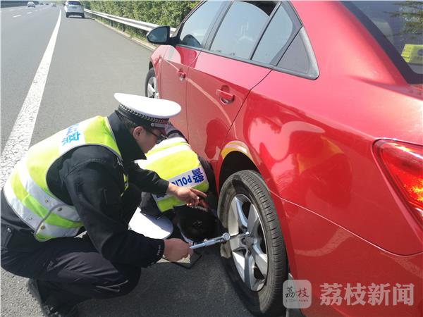 4月29日,盐城交警高速二大队执勤民警王岩、王国庆在辖区道路沈海高速连通巡逻时,发现应急车道内停放一辆连云港牌照的小轿车,护栏车外一女青年抱着小孩,一名男青年在车旁焦急地四处张望。民警急忙上前询问,男姓驾驶员惊魂未定地说:“车辆正在好好跑着,忽然方向猛的偏移,幸好握紧了方向盘,慢慢将车靠在了应急车道,下车一看轮胎爆了,轮胎从来没有换过。” 为避免危险状况的发生,民警把警车停在故障车后方,摆放三角牌。迅速帮其更换轮胎,民警的帮助下,车辆故障被妥善排除,换好轮胎后的民警衣服已被汗水打湿。司机看到修好的车,急忙握着民警满是灰土的手感谢不已,并着急赶路去苏州,心里更是着急,多亏了几位民警及时的帮助。受到惊吓后孩子不停地说道:“感谢警察叔叔!”。