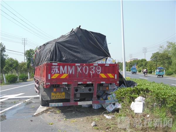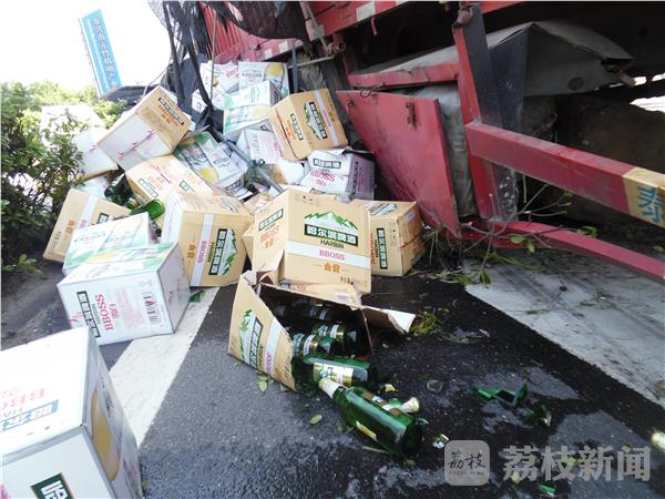 笔者路过此路段时发现一辆红色大卡车停在省道中央隔离带的西侧,现场散发着浓烈的酒味,公路中央隔离带上散落着许多啤酒箱,还有一些被摔坏的啤酒瓶,隔离带里一根分道行驶标志也被撞倒在地上,绿化带里留下车辆撞击后深深的凹槽。汽车右侧挡板横梁也被甩落在旁边,据货车驾驶员介绍他由南向北沿着省道行驶接近人行横道时,一辆电动车突然从东侧转向省道,为避免撞到电动车,他急打方向车辆撞到了公路中间的绿化带。车上装载的啤酒哗啦啦倾覆了好多箱,许多啤酒瓶被摔碎,啤酒流了一地。目前车主正联系车辆驳载啤酒。