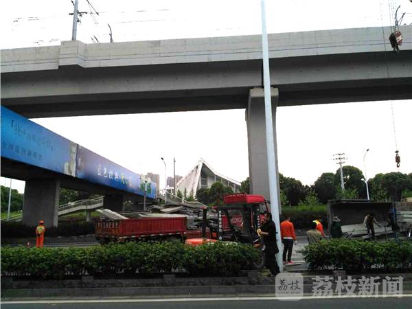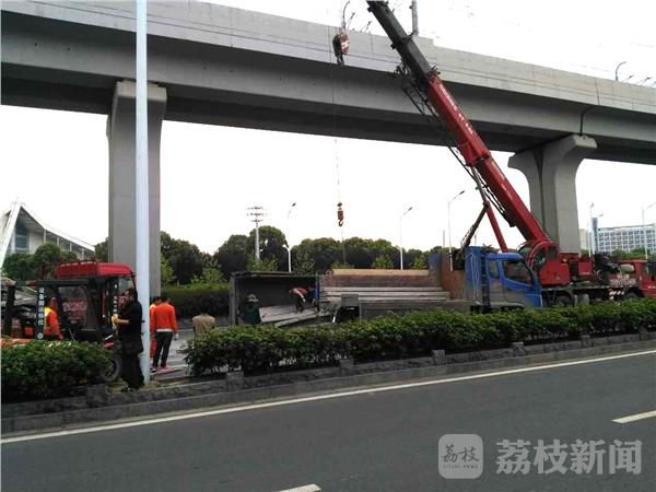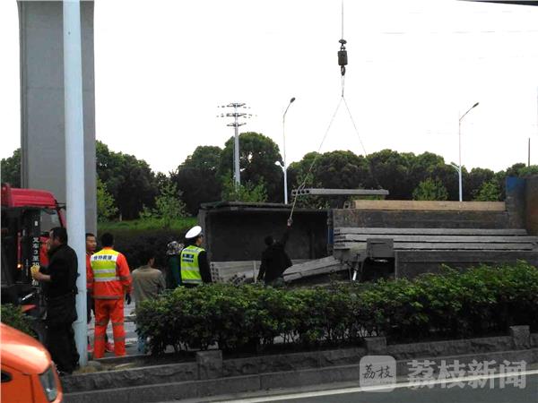 今天(5月3日)早晨六点半左右,在南京市江北大道葛塘段由北向南方向,一辆拖运楼板货车冲撞到中间隔离带,造成车辆侧翻路面,车上楼板全部倾翻在路面上,当时正值早上班出行高峰,造成六合往南京方向交通一时间受到影响。