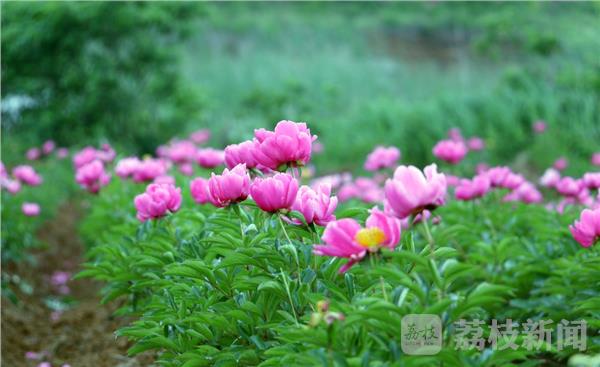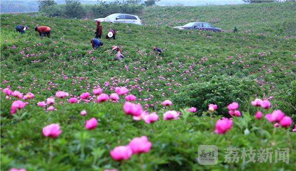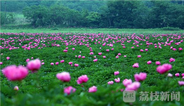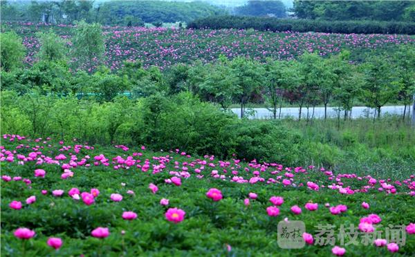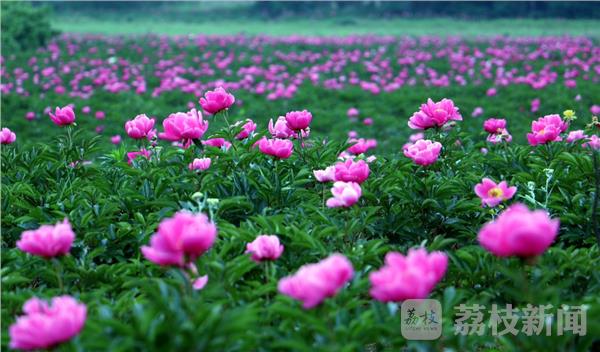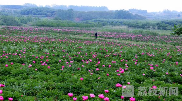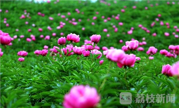 走进这连片种植的千亩芍药园里,只见满目的芍药花红绡绽放,如锦似霞。
