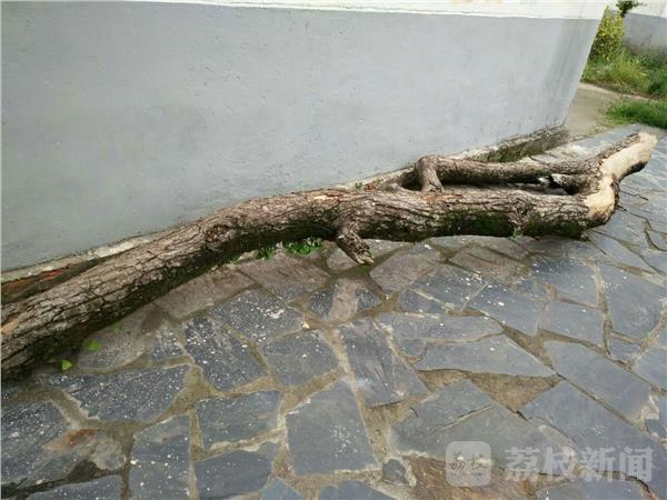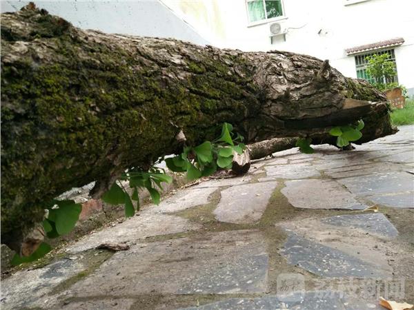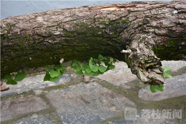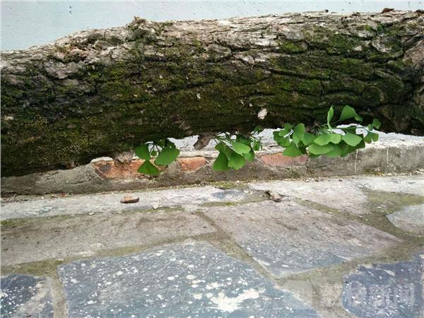 记者在现场看到,这段静静躺在墙角的银杏枯树枝约3米长左右,粗的地方有30厘米,仔细一看,枯树的枝干上已经长出了绿绿的银杏叶,呈现出勃勃生机。