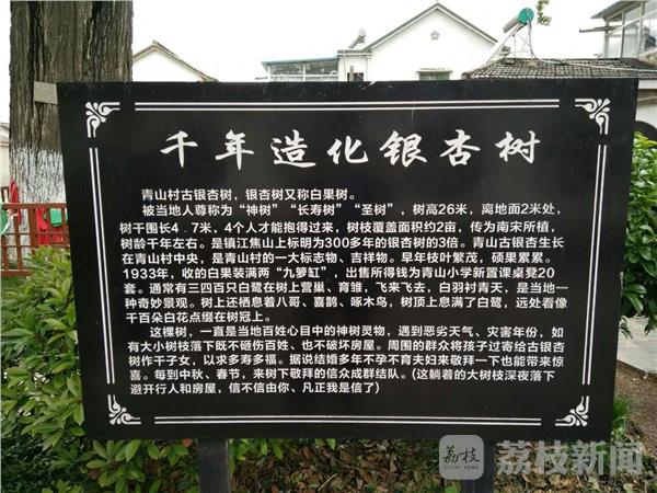 据悉,句容边城镇的青山古银杏树树高26米,树干围长4.7米,4个人才能抱的过来,树枝覆盖面积约2亩,传为南宋所植,树龄千年左右,该树长在青山村中央,已成为青山村村民心目中的一大标志物,吉祥树。