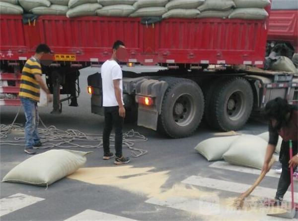 据附近做生意的一位市民讲;当时车辆行驶到路口想原地调头,由于车上面拖运的货物太多足有30吨左右,而且堆码的明显往前倾斜,转弯时候突然几十包翻到路面,庆幸的是当时正好附近没有车辆和行人,否则后果不堪设想。事故发生后,驾驶员及时喊来人员一边维持交通秩序,一边清理现场,使交通很快恢复正常。虽然没有造成重大事故,不过网友还是希望驾驶员朋友,安全不容忽视,违章是事故的根源,出了事故再来弥补那就迟了。