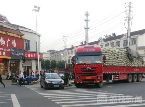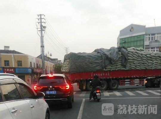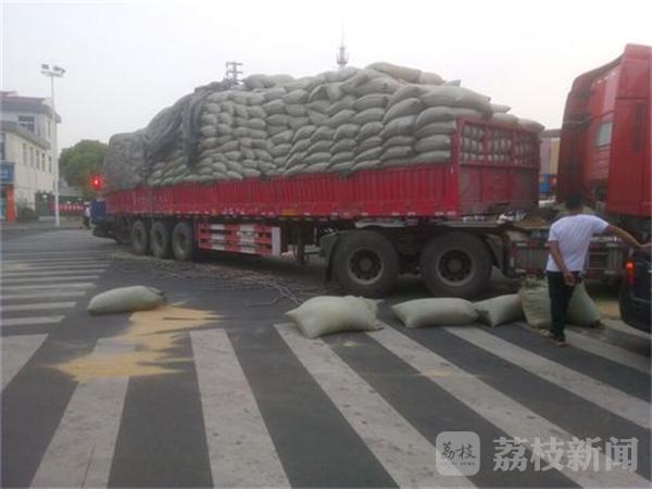 今天(5月5日)晚上六点左右,一辆运输袋装货物的半挂车,行驶到南京市六合区新集街道交叉路口的时候,车厢前侧几十包饲料全部侧翻路面,造成路面交通受到一定影响。