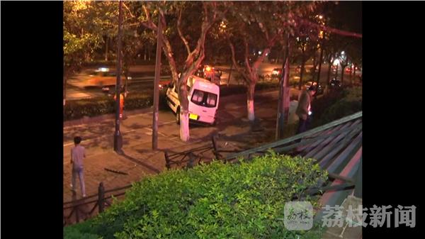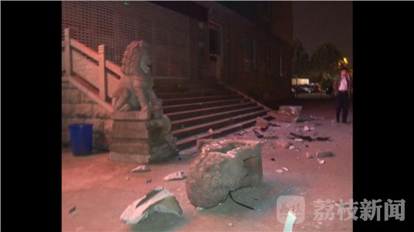5月5日晚10点,南京市雨花南路农业银行门口,一辆电动商务车起步时突然失控,撞毁银行门口的狮子后,又冲下数米高的台阶。商务车停在非机动车道上,车前损毁严重,台阶上的钢管扶手全被撞断,银行门前一只石狮子也被撞毁。
