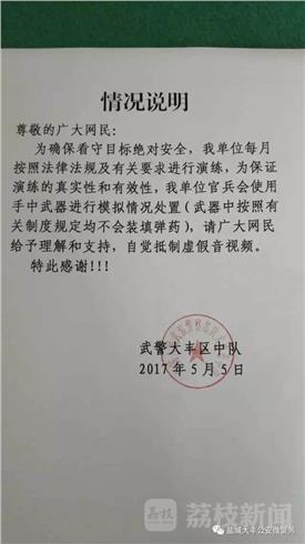 大丰区警方得知此事立即介入调查,并没有发现看守所有人越狱等意外情形。警方表示,视频里的“枪声”像是拍视频的人在敲打什么东西。中午时分,武警大丰区中队发来一份情况说明,内容称:为确保看守目标绝对安全,我单位每月按照法律法规及有关要求进行演练,为保证演练的真实性和有效性,我单位官兵会使用手中武器进行模拟情况处置(武器中按照有关制度规定均不会装填弹药),请广大网民给与理解和支持,自觉抵制虚假音视频。