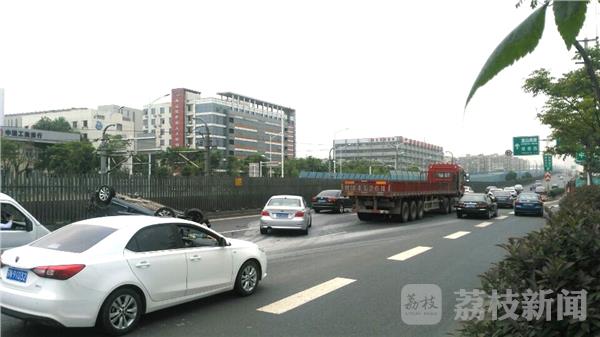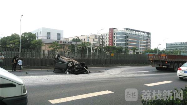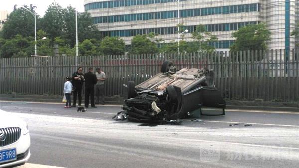 今天(5月6日)下午四点半左右,南京市江北大道发生一起交通事故,一辆半挂车和一辆银灰色小轿车发生碰撞,造成小轿车翻车,庆幸的是小轿车驾驶员及随车小女孩毫发未伤。