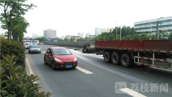 记者在现场看到小轿车严重变形,零配件散落一地,路面满是油污,小轿车基本上已经报废。据小车驾驶员讲:“当车行驶到高新开发区附近一匝道口准备上高架桥时候,突然车子一阵颤抖,随即车子就翻一个跟斗,好在系着安全带,自己和女儿一点伤没有受到,最后在大家的帮助下从变形的轿车里面爬出来,简直是不幸中的万幸。”半挂车驾驶员也直倒苦水,他说自己也搞不清楚车子怎么刮碰的他的车子的,一点感觉没有。事故发生后造成交通拥堵,南京交警九大队接到报警后迅速赶到现场疏领交通维持秩序,事故发生具体原因警方正在展开调查。