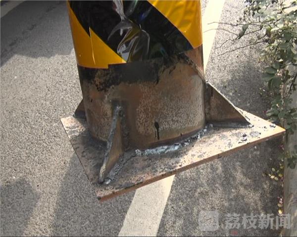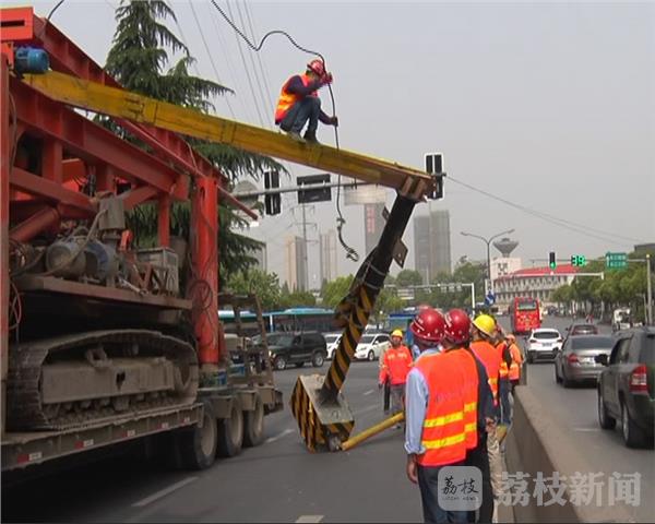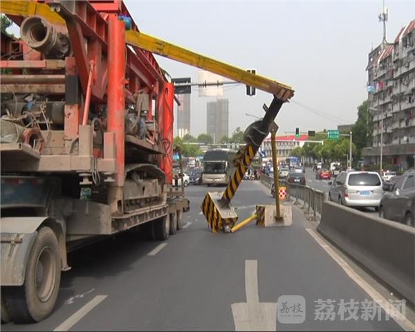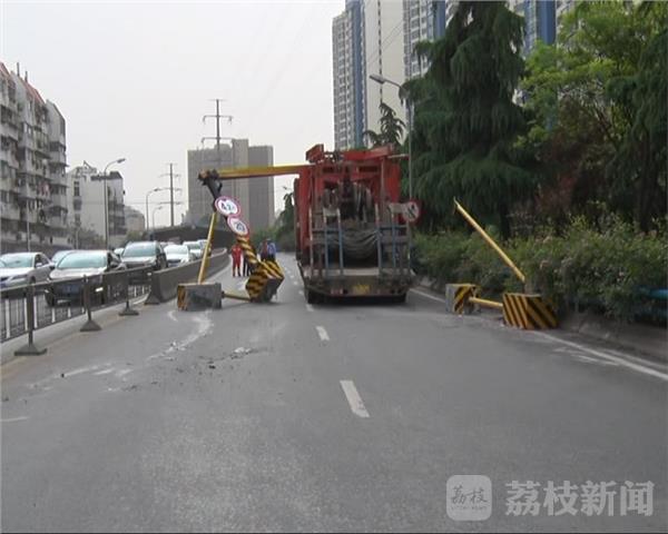 今天(5月6日)上午八点钟左右,南京鼓楼区郑和北路上一处刚树起来才几个小时的限高架,被一辆大型平板车撞断。来看现场。限高架被撞得东倒西歪,中间的横梁卡住大型平板车上的打桩机,致使平板车进退两难。