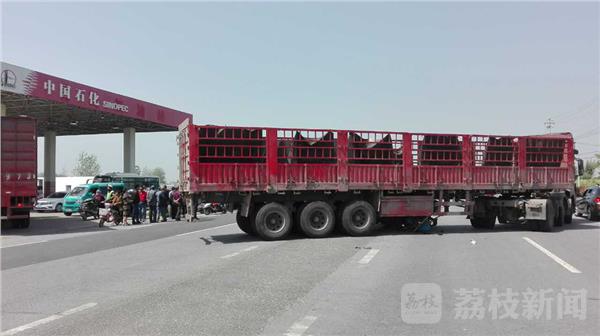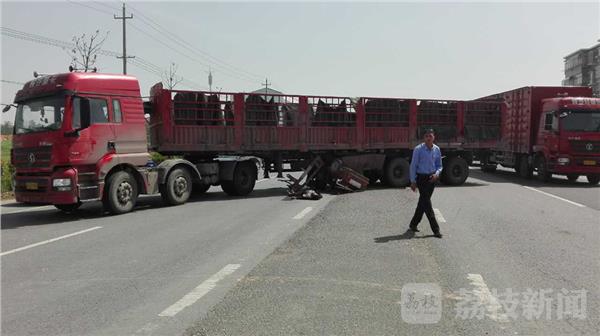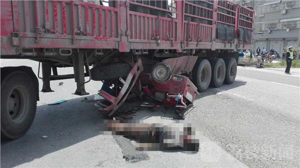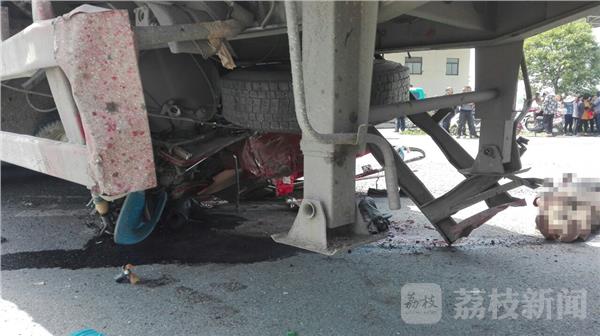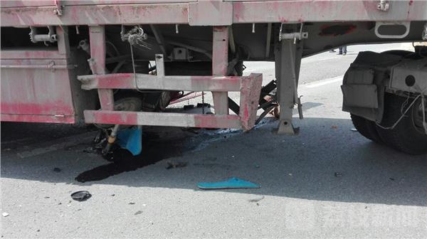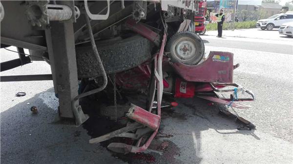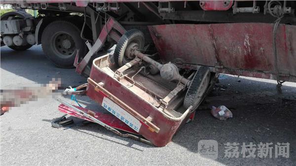 5月7日下午1点多钟,在省道226线射阳县千秋镇为民加油站门前路段,一辆由北向南行驶的摩托三轮车疑因避让不及,撞上从加油站出来左拐弯朝北行驶的大货车,事故导致三轮车上三名驾乘人员一死两伤,车辆损坏。记者赶到现场时,受伤的两名驾乘人员已被120救护车接送到医院抢救,一名老年妇女仰面躺在路中央安全线上,已经没有了生命迹象,一辆大货车头朝东横停在公路上,占据了双向四股车道,导致该路段通行缓慢,一辆摩托三轮车车轮朝上卡在大货车的车厢下方,损坏严重。