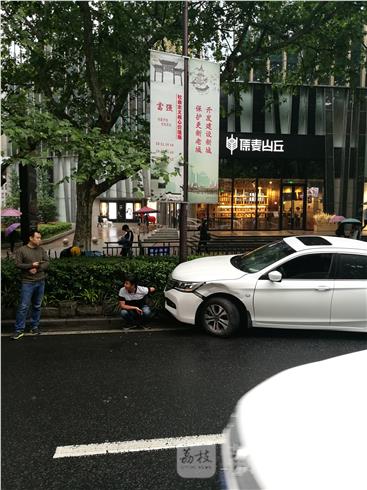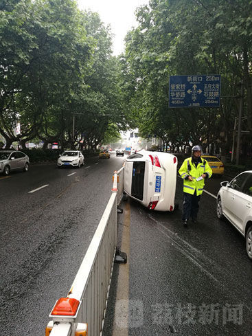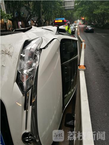 在现场交警向荔枝记者介绍,汉中路靠近新街口段车流量一般比较大,这两辆车的速度都不会太快。白色本田是从金鹰门口慢车道并线进快车道的,因雨天路滑,快车道上的丰田车避让不及导致车祸发生。丰田车被当场撞翻在中心隔离栏上,本田车则一头骑上了绿岛。这样原本只有两个车道的汉中路,在清障车到来之前,只留下了一股道通行,拥堵在所难免。
