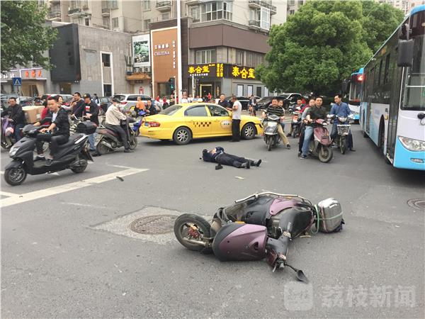 5月6日下午6时,在南京秦淮区大中桥路口,一辆出租车从大光路由东向西准备左转弯时撞上一辆骑反道的电动车,电动车车主倒地不起,直到民警到达现场后才缓过劲来,并在出租车司机的搀扶下坐起来。