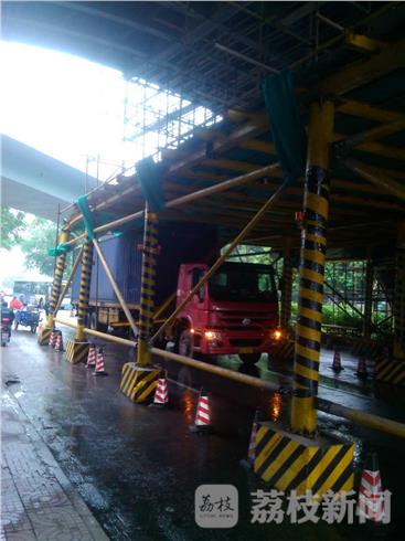 5月8日下午2点半左右,一辆集装厢车由东向西驶入鼓楼区水关桥大桥下,不慎卡在了长江大桥维修铁架下,引发交通堵塞。经交警部门协调指挥,找来修桥工人,将铁架拆除,这辆集装厢车5点左右被拖出。
