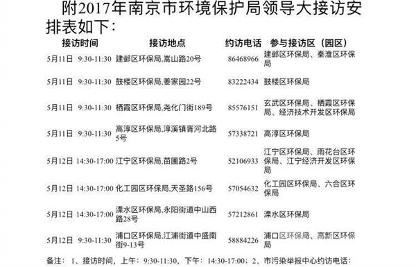 今年环保局长大接访将结合“走千企入万户助发展促富民”大走访活动,深入基层采取约访和接访相结合的方式,全市设立8个点,由南京市环保局领导会同区(园区)环保局主要领导到点参加大接访活动。接访内容包括:违反环保法律法规和侵害公民、法人或者其它组织环境权益的事项;对全市环境保护工作提出的批评、意见、建议;对全市环保系统工作人员提出的批评、建议。