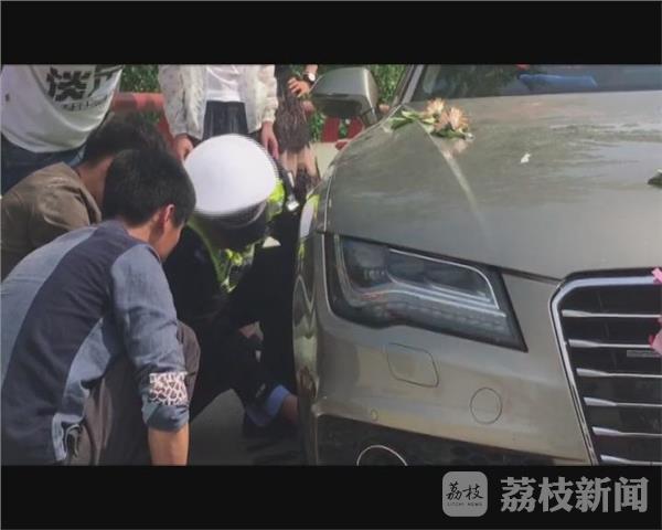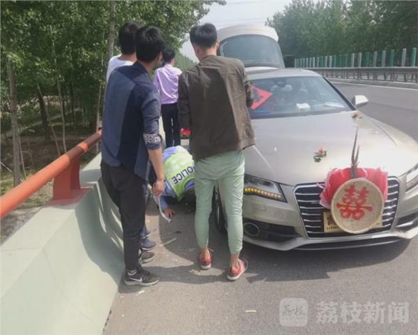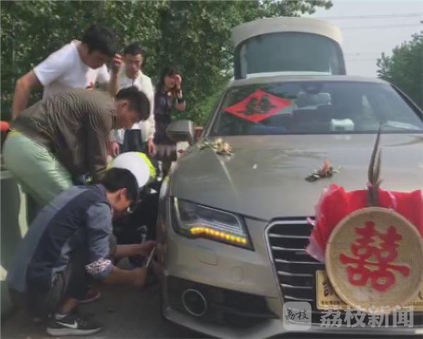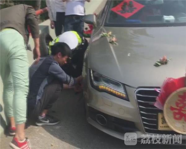 宿迁市交警支队高速二大队大队长朱德刚:“我发现路边停着两辆车,后面有两个小伙子,在路面上摆了三个纸箱,后来我到现场了解情况,他们是带新娘的车,在那边突然轮胎抛锚了,轮胎爆胎了。 民警观察发现,对方摆动三个纸箱距离车辆并不远,存在安全隐患,但最让人苦恼的是,对方并不会实用工具更换轮胎。”