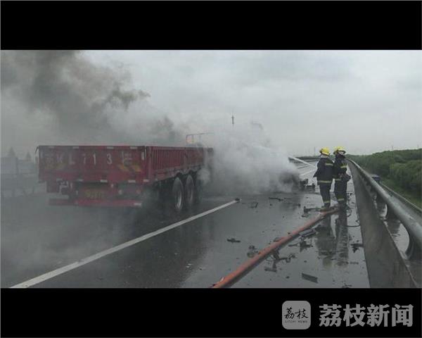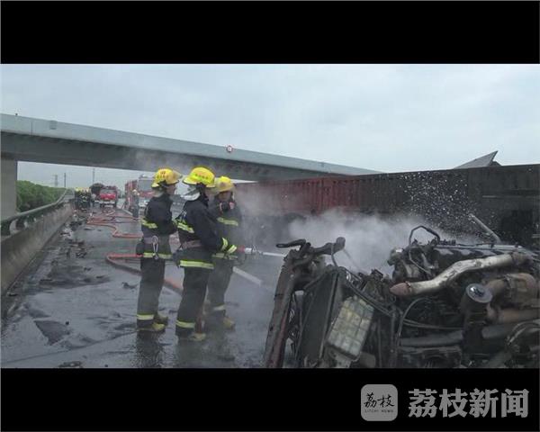 营救人员到现场发现,一辆挂车撞上立交桥护栏后,车头坠落到立交桥下,司机已被现场民警救出转移到草地上。挂车车身横在立交桥上,油箱受到撞击后破损起火。经过消防20分钟的扑救,火势被彻底扑灭。