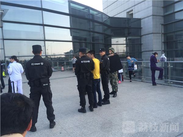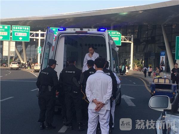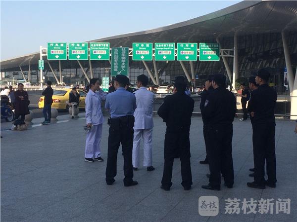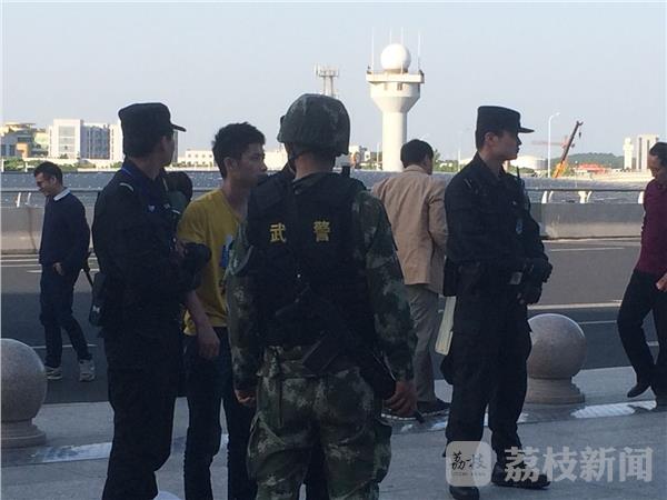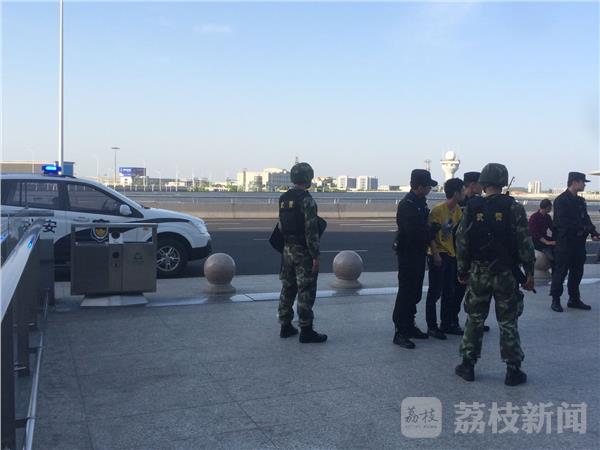 昨天(9日)下午,在南京禄口机场送站平台交通中心门口,荔枝新闻网友发现有不少围观旅客,公安、武警、特勤、医护人员均在现场,有一名年轻人被两位特勤挟持住,不让他乱动。