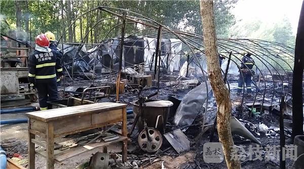 现场火势很快被消防员控制,大棚内所有物资基本上全部烧毁,路边站着许多围观村民,据知情人透露,大棚因电路原因引发火灾,目前大棚起火损失过万,具体损失和起火原因还有待消防部门调查。