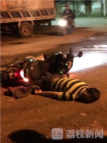 记者闻讯赶到现场时,该男子还面朝下趴在地面上,一只手还握着手机,随后男子自己坐了起来,记者看到地面上还有大滩血迹,血迹中有男子摔掉的牙齿,男子面部嘴巴部位血肉模糊,意识清醒,男子表示晚上喝了白酒,当时在看手机。据居民介绍,男子当时酒后骑电瓶车看手机导航,可能没有看到路中间的坑塘便一下摔了下来。