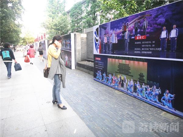 今天下午荔枝新闻网友途经长江路,看到沿第九中学的百米围墙上整齐地矗立着22块京剧演出海报,市民经过这里纷纷放慢脚步,有的驻足仔细浏览观看。