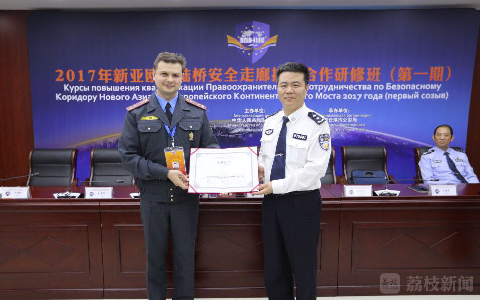 5月12号下午,由公安部主办、江苏省公安厅协办、连云港市公安局承办的首期新亚欧大陆桥安全走廊执法合作研修班举行结业典礼。连云港市副市长、公安局长王永生出席并致辞,省公安厅国合局一级警长任晓光,市公安局领导王方安、宋雅波、鲁宏、杨德祥等领导参加。来自白俄罗斯、哈萨克斯坦、吉尔吉斯斯坦、塔吉克斯坦、土库曼斯坦5国的22位警务官员在经过十二天的培训研修后结业。