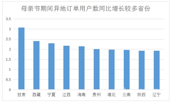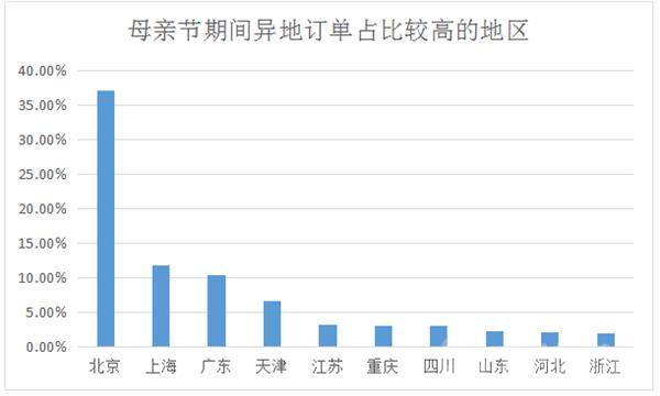 不过,大部分礼品都是通过快递送达的,与经济发展的城市分布相对应,北上广地区企业聚集,也成为众多年轻人梦想的实践地。母亲节期间,这些地区产生了最多的异地订单,江苏排名第5。同时,越来越多经济欠发达地区的用户也使用异地下单的方式,为远方的母亲送上节日的礼物。2016年母亲节期间,全国异地订单的用户数、订单量同比增长超过50%。从中我们能看到,网购已成为人们节日表达心意的重要方式,同时也反映出代际分离,两代人异地生活的比例很高。