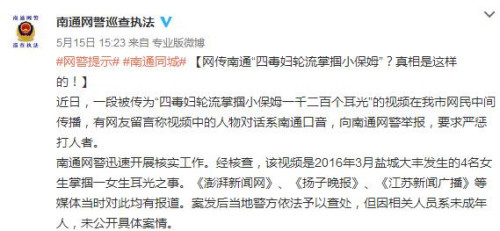 中新网5月16日电 针对网络上近日流传“四毒妇轮流掌掴小保姆一千二百个耳光”的视频,江苏省南通市公安局网络安全保卫支队日前通过官方微博公布真相,称该视频是2016年3月盐城大丰发生的4名女生掌掴一女生耳光之事。