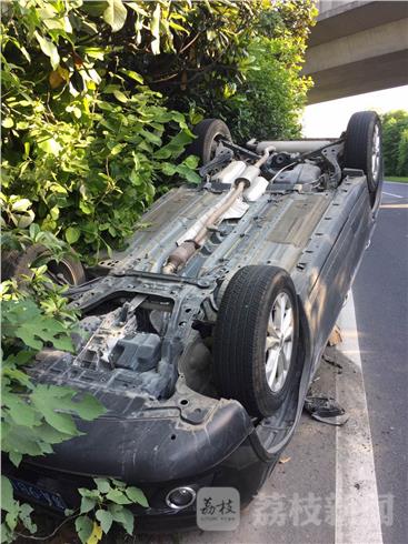 今天(5月17日)下午4点半,由宁杭高速公路连接南京绕城公路的匝道上,一辆车号为苏A9B1W3的小车,由于车速较快,与前方车号为苏A27X10的小车相擦,碰擦的位置是前车的右侧后轮上部,后车急刹翻了,冲到路边绿化带边缘,四脚朝天。