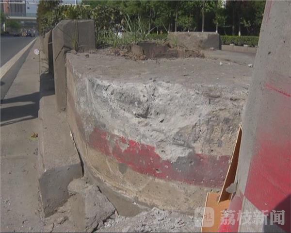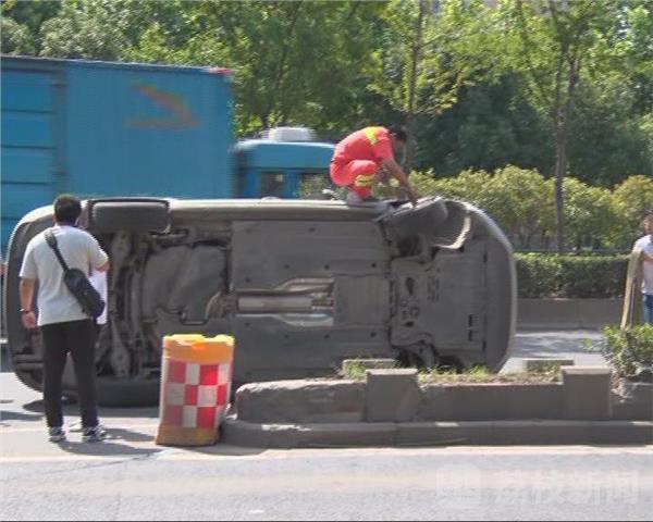 据司机储先生讲当时两边都有车辆,由于大车挡住了自己的视线,当发现前方绿岛时已经来不及避让了,轿车右前轮直接撞上了绿岛水泥墩上,右前轮爆胎,造成车辆侧翻,车内气囊打开,两人从车天窗爬了出来,驾驶员左手臂流血,车内一女士肩部受伤去了医院。附近居民告诉记者,这里已经不是第一次翻车了,驾驶员思想不集中是一个因素,这里的分流标示不清,分流线太短,都是造成事故的原因。