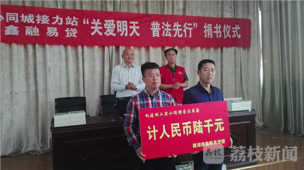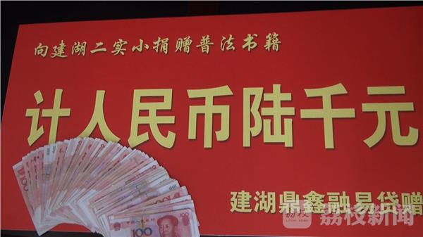 在学校举办的“关爱明天、普法先行”的捐书活动仪式上,建湖县爱心同城接力站负责人向第二实验小学捐赠了五千元的普法教材读本,爱心人士孙勇敢个人捐赠了六千元的普法教材读本。