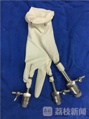 中大医院妇产科沈杨副主任医师最近发明了“秘密武器”——由支撑环和橡胶手套组合成的操作平台,在江苏省内率先完成了单孔腹腔镜手术。这一手术要肚脐处穿刺一个小切口,手术器械要通过各个“秋卡”进入腹腔。沈杨用一截硅胶导尿管缝合成一个圈,套在手术用橡胶手套的手腕处缝合固定,手套取三个手指剪开,接入“秋卡”固定住。橡胶手套质地轻薄,连接到穿刺孔后易被气体冲出来,因此以支撑环固定并加上湿纱布增加气密性。这款操作平台经济实用,为患者减轻了负担,而且使用的都是医用耗材,经过严格的消毒,安全可靠。