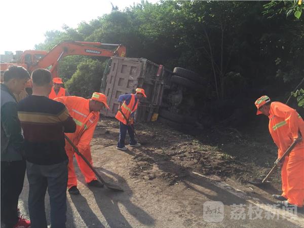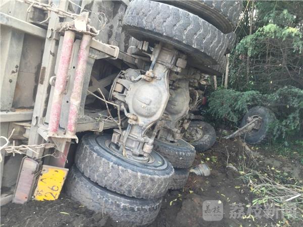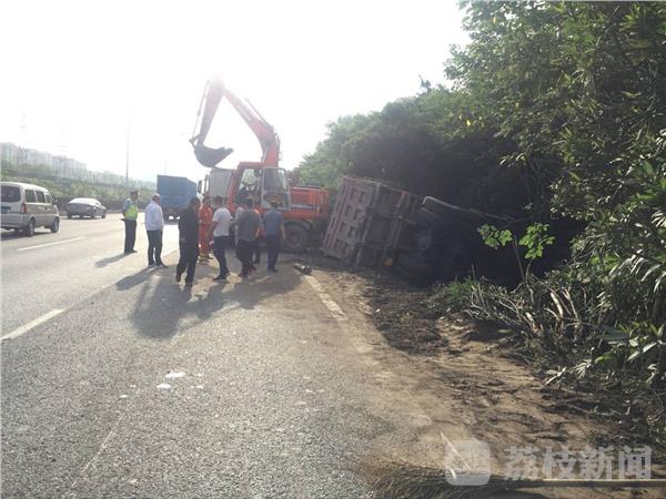 5月25日6点,在绕城公路二桥往三桥方向铁心桥闸道附近,一辆满载的渣土车冲下护坡翻车,幸好司机没有受伤,但车辆受损严重,车前轮脱落,挡风玻璃破碎。
