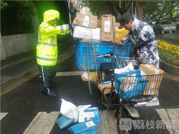 5月23日一名快递小哥在西康路路口,因载货过多加之雨天路滑,骑车翻倒在地上,其车上所载物品也随之散落在地,有的还砸到了身边的其他骑车人,所幸没有造成人员受伤。而此前,江东北路东宝路路口,一名男子骑着一辆满载超长货物的电动车在路口被民警拦下,其货物超长达1米余,骑行过程中,特别是转弯时,很容易带倒身边其他人,经询问他是兼职送快递的,当民警告知其违反规定载物时,该男子拒不认为违规,不配合出示身份证件接受检查,并对民警进行辱骂、在民警将其带回大队进一步核实的过程中,该男子竟然从他随身所带的包中拿出一瓶辣椒水喷射民警。还有,熊某骑电动自行车车上捆装的是超长超高超宽的铝合金钢架,沿虎踞路由南向北行驶超越正在骑自动自行车的何某,造成何某受伤,熊某负此事故的全部责任。