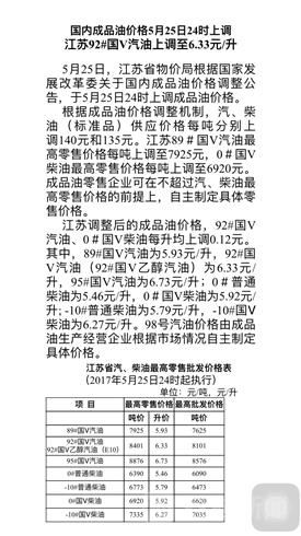 5月25日,江苏省物价局根据国家发展改革委关于国内成品油价格调整公告,于5月25日24时上调成品油价格。