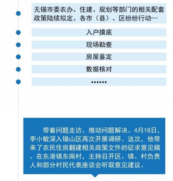 近年来,无锡市人大代表、政协委员多次提出有关出台农村居民住宅危房翻建相关政策的建议提案。今年开展“大走访”以来,基层广大干部群众多次提出改进农村住房建设管理的诉求。为此,无锡市委市政府高度重视,市委主要领导亲自带队,多次深入基层听取群众意见。在广泛听取民意、充分调查研究的基础上,市委市政府出台了《关于加强和改进农村住房建设管理的意见(试行)》。
