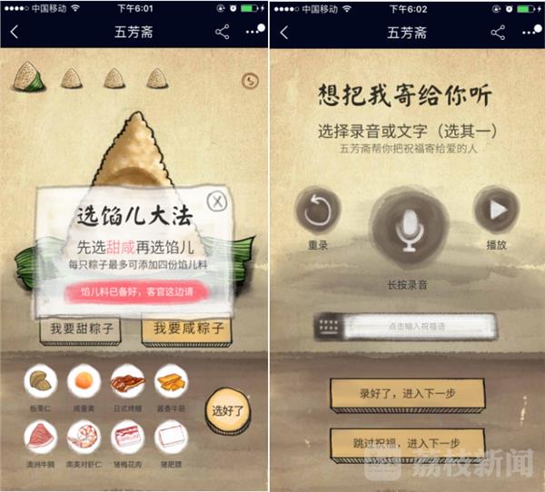 比如,登录天猫五芳斋官方旗舰店页面,用户可自由选择甜粽、咸粽两大类和鳗鱼、奶黄、牛腩、南美对虾等多种创新口味。不同的创意组合高达10000种,首次实现粮油领域的“私人订制”,与此同时,线上还能送出语音祝福。