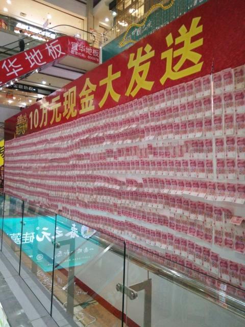 记者赶到该卖场看到,“10万元现金大发送”几个黄色大字下面,满眼都是百元大钞,一旁围了众多评头论足的市民。据目测,“大钞墙”长5米左右,高2米多。10万元现金怎么个大发送?卖场宣传海报显示,凡是定购两个品牌的顾客都可以参与平分10万元现金,定2单分一次,定4单分两次,以次类推(举例:如活动现场有100个客户定购两个品牌,即每人可分得1000元现金)。记者随机采访现场市民时,不少人认为这是商家玩的“噱头”。“拿钱肯定是有条件的,今天放假,本来来的人就多,加上搞活动,人就更多了,上千人甚至几千人买东西,分到的钱就少得很了。”一位顾客说。现场也有人表示,商家为聚集人气搞促销,现金分多分少就是个气氛,不必太当真。只是这样的做法,好像有损人民币形象。