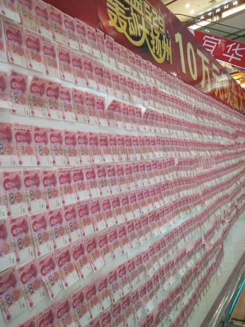 交汇点讯“不得了,这么多现金贴在墙上,全是崭新的百元大钞,促销搞成这样,合适不合适呀,反正我觉得不太好。”今天上午,有读者致电记者称,位于扬州运河东路的一个家居卖场,举行促销活动,一面展示墙上贴满了百元大钞,很是扎眼。