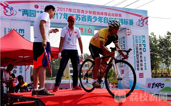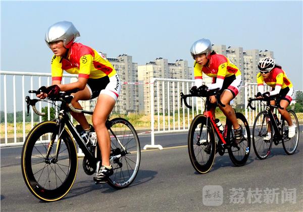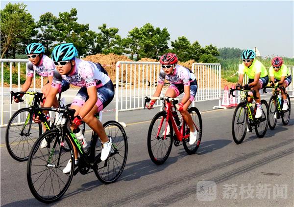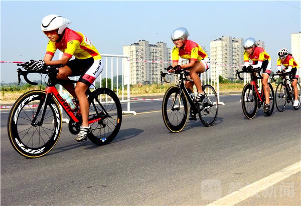 2017年6月3日,江苏省扬州仪征市枣林湾生态园的汉金大道上,一队自行车运动员正在你追我赶勇争先锋。“两园杯”2017年江苏省青少年自行车锦标赛(公路、山地)在仪征市枣林湾生态园正如火如荼进行,来自全省各地代表队的100多名选手,参加为期4天的名次争夺赛。