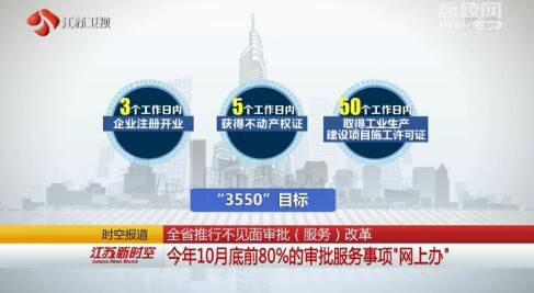 方案要求:在全省建立“不见面审批(服务)”体系,依托江苏政务服务网,加快推进“网上办、集中批、联合审、区域评、代办制、不见面”。各市、县(市、区)人民政府和省级部门全面梳理公布“不见面审批(服务)”事项清单,到今年10月底前,实现80%的审批服务事项“网上办”,尽快实现“企业3个工作日内注册开业、5个工作日内获得不动产权证、50个工作日内取得工业生产建设项目施工许可证”的“3550”目标。此外,还要进一步推进集中高效审批、企业投资项目“预审代办制”、联合评审、区域评估等改革措施,并加强事中事后监管。