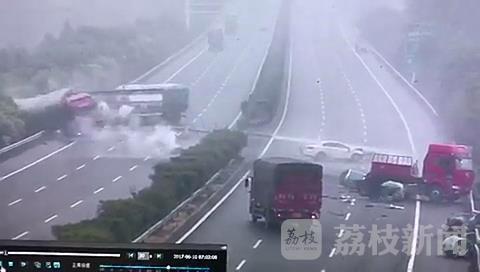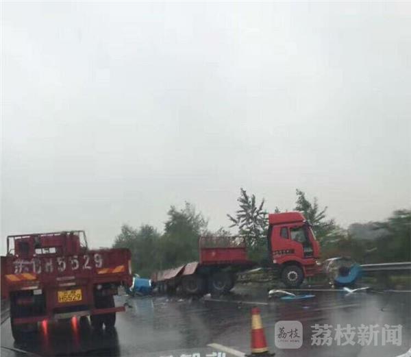 6月10日7时10分左右,启扬高速下行线221公里路段,李某清驾驶重型半挂牵引车(江西号牌)与刘某生驾驶的重型半挂牵引车(河北号牌)及韩某辉驾驶的重型半挂牵引车(河北号牌)发生碰撞事故,事故造成刘某生当场死亡,三人受伤,三车受损,并造成重型半挂牵引车(江西号牌)上所装载的丙二醇部分泄漏(该车系危险品运输车),无危险,经过消防部门和高速交警的合力处置。