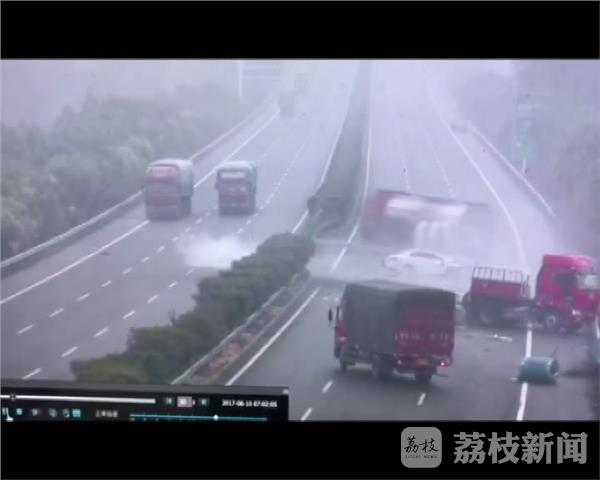 据监控视频显示,一辆货车疑因雨天路滑,在行驶过程中失控,撞断高速公路中央护栏后,冲入对面车道,与其它车辆发生碰撞,导致四人被困,情况紧急。当地交警、消防、120急救、安监等部门闻讯,迅速赶赴现场救援。