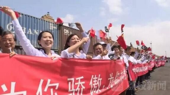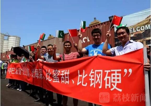 ▲ 码头欢迎人员打出“中巴友谊‘比山高、比海深、比蜜甜、比钢硬’”的横幅