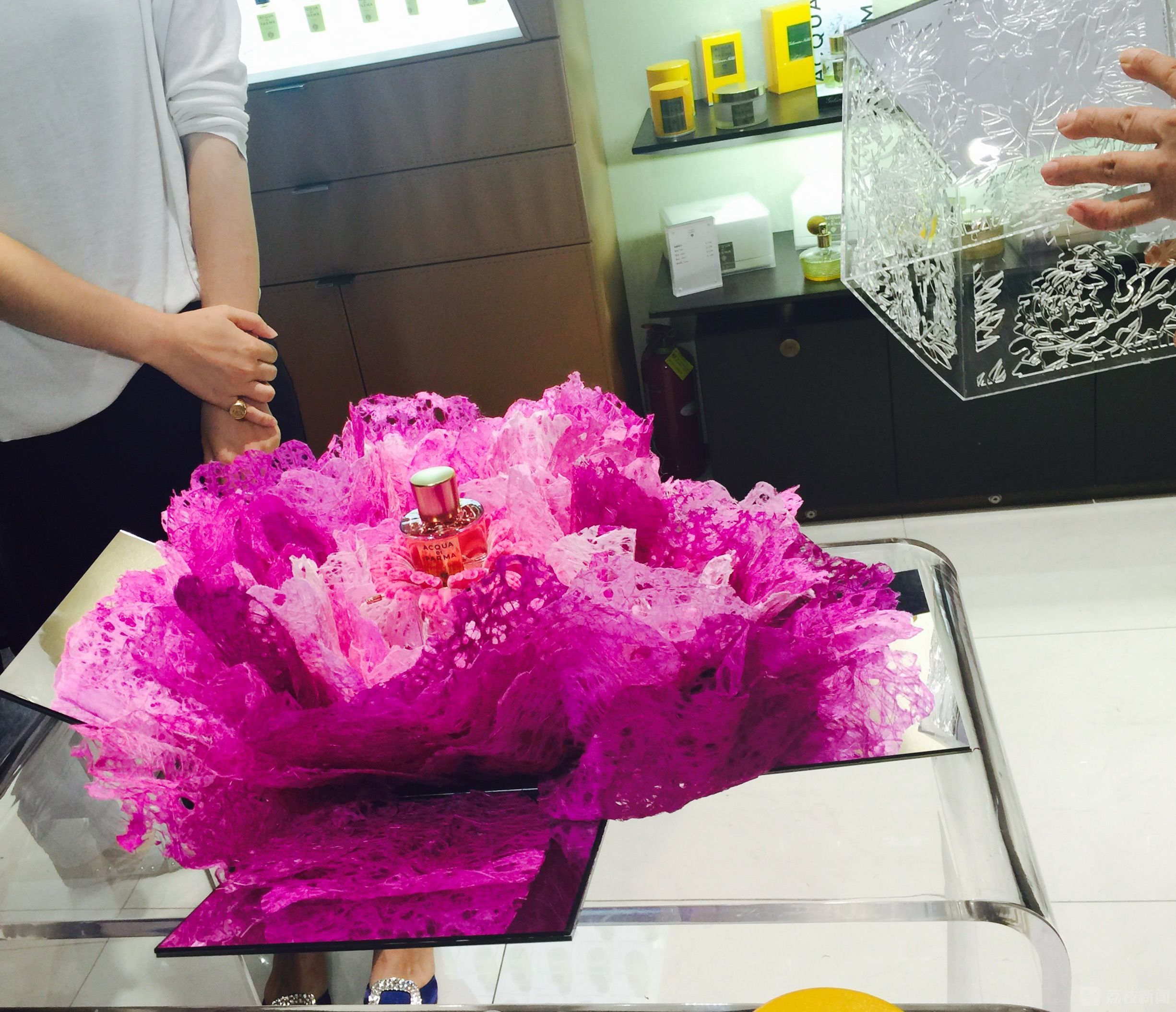 JUJU WANG介绍道,礼盒设的计灵感来自牡丹绽放的瞬间,“觉得很美,希望这个瞬间可以以一种灵动的方式展现出来”。活动现场,JUJU WANG与赵树宪共同打开了礼盒盒盖。直径50厘米的粉色牡丹翩然绽放,围绕在牡丹香水四周。粉色牡丹花心部分由南京绒花工艺打造,经过艺术化处理之后,它亦是装饰物,亦可取下作为胸针佩戴。