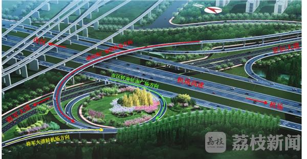 龙西互通二期工程位于江宁区与雨花区交界处,是机场高速和宏运大道相交的节点,二期工程整体呈一个圆弧形,全长约1.6公里,设计速度每小时40公里,它是在一期工程基础上新建三个方向的匝道,分别是市区转南站南广场方向、南站南广场转机场方向、将军大道转机场方向。
